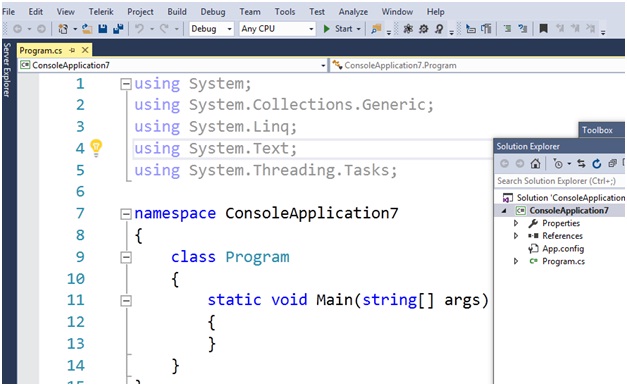 بیایید اولین اپلیکیشن‌مان را در C# بنویسیم: برنامه‌ی “Hello World”. این ساده‌ترین برنامه‌ای است که می‌توانید در C# بنویسید.